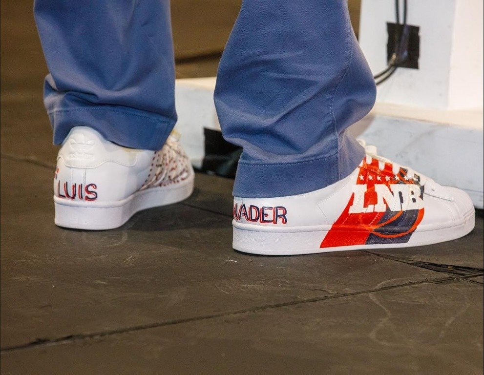 El presidente lucía unos tenis blancos con rojo con sus iniciales, LMB, durante la habitual cita de LA Semanal con la Prensa, donde ofreció detalles sobre la inversión histórica en infraestructura deportiva y preparación de atletas para el evento.