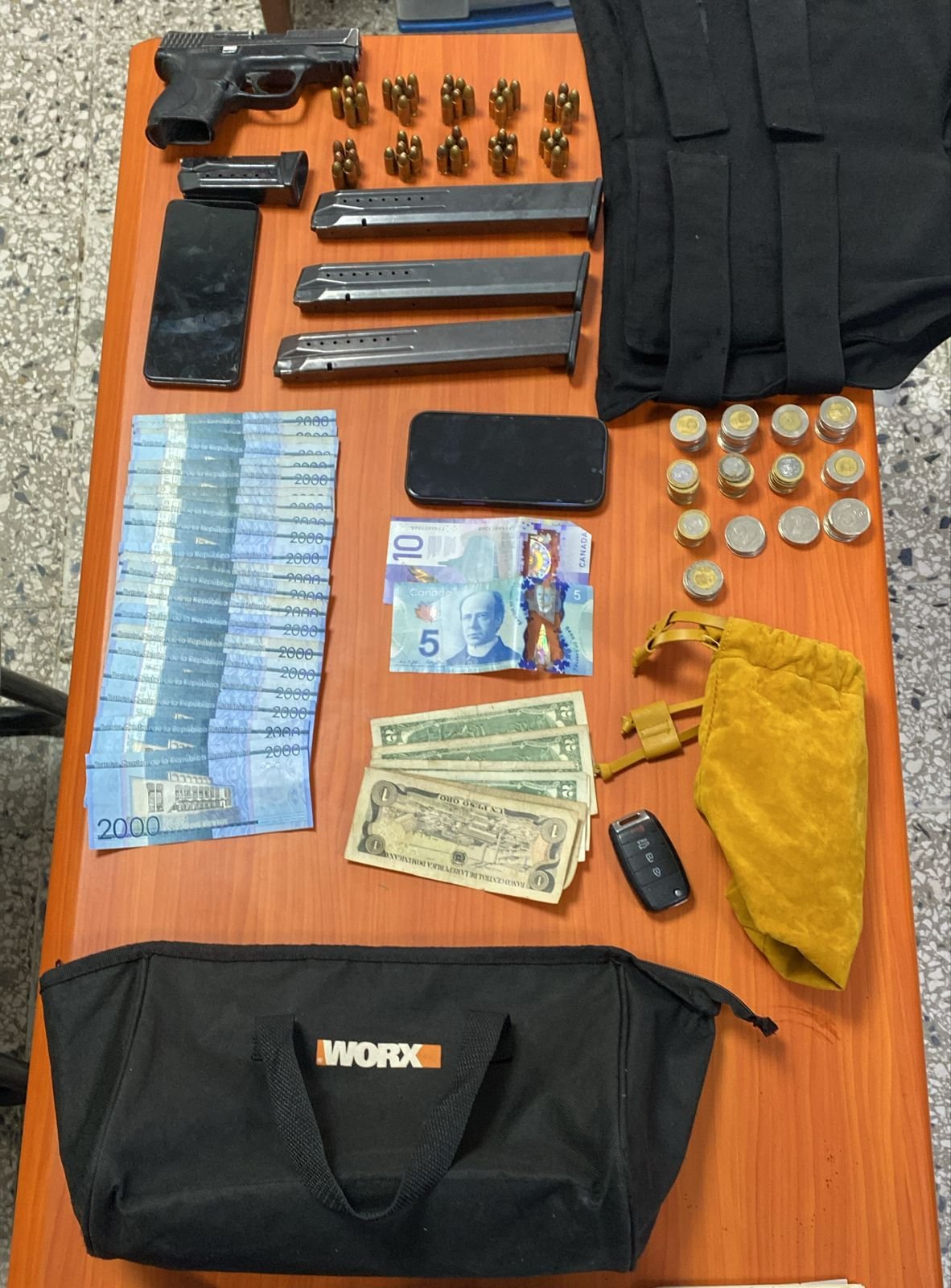 Durante la requisa, las autoridades incautaron un vehículo marca Kía, modelo K5, color mamey, placa A928699, una pistola Smith Wesson y tres cargadores, la cual portaba de manera ilegal. Un bulto en el que había 40 mil pesos, diez dólares, 15 dólares canadienses, un chaleco antibala, de color negro, cincuenta y cinco cápsulas calibre 9MM, dos teléfonos celulares, uno marca iPhone, de color azul, y otra marca TCL, de color negro.