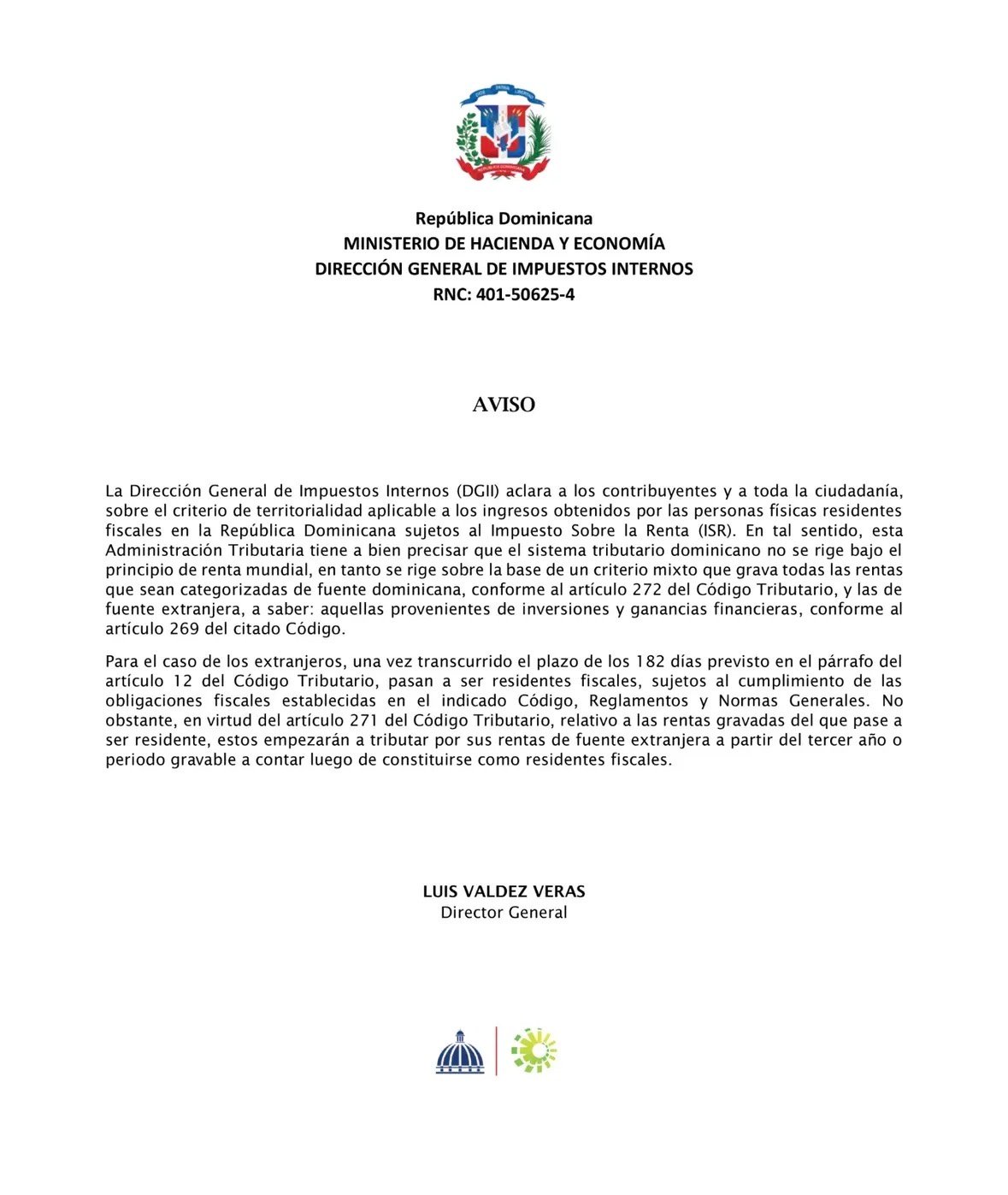 A través de un comunicado, la institución explicó que este criterio grava todas las rentas consideradas de fuente dominicana, conforme al artículo 272 del Código Tributario, y las de fuente extranjera únicamente en los casos de inversiones y ganancias financieras, según lo establecido en el artículo 269 del mismo Código.