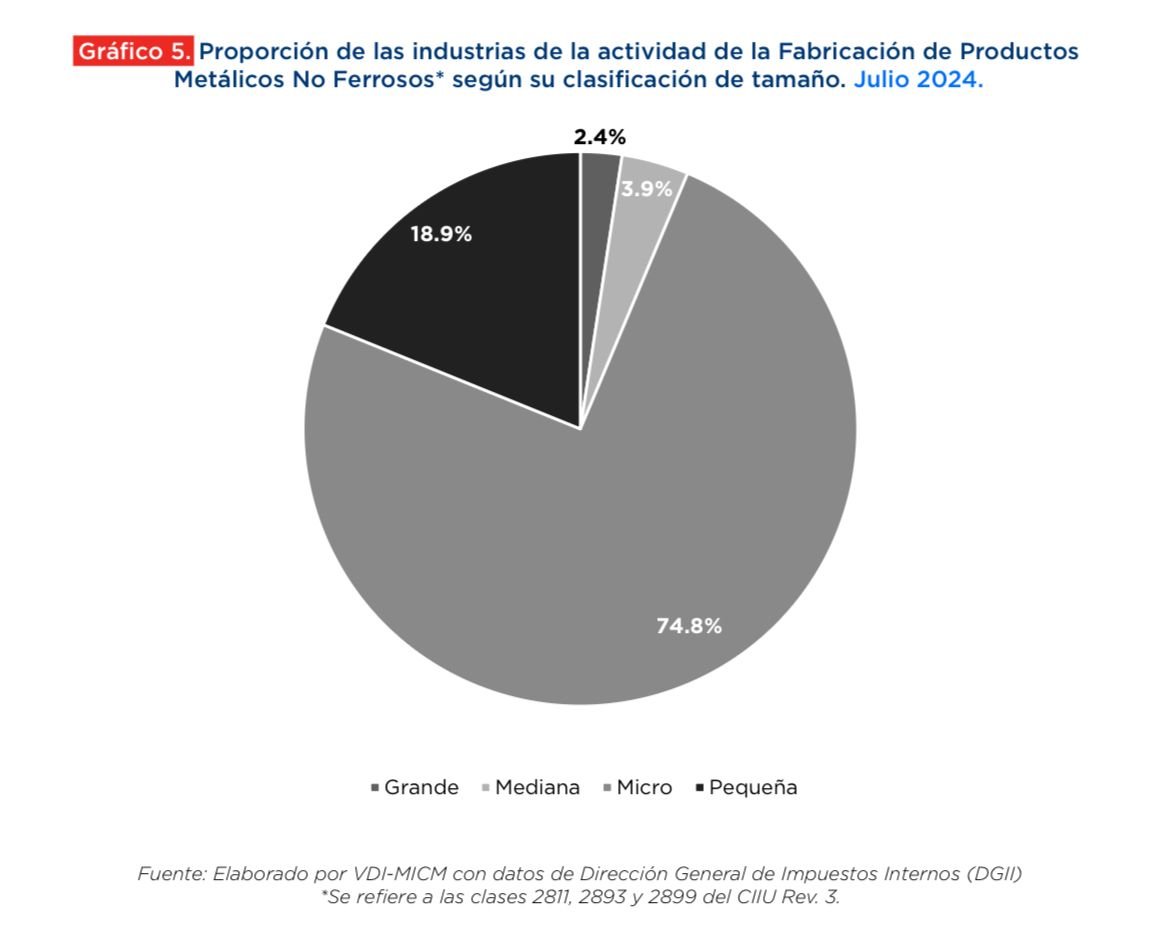 El documento resalta que en el país existen alrededor de 869 industrias dedicadas a la fabricación de productos metálicos no ferrosos, de las cuales el 97.6 % son Mipymes (74.8 % son micro, el 18.9 % son pequeñas y el 3.9 % medianas) y el resto grandes (2.4 %).