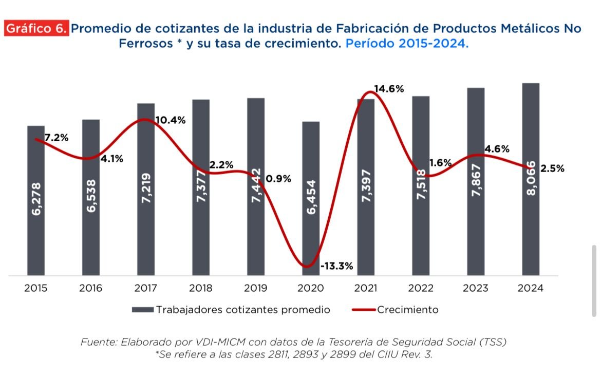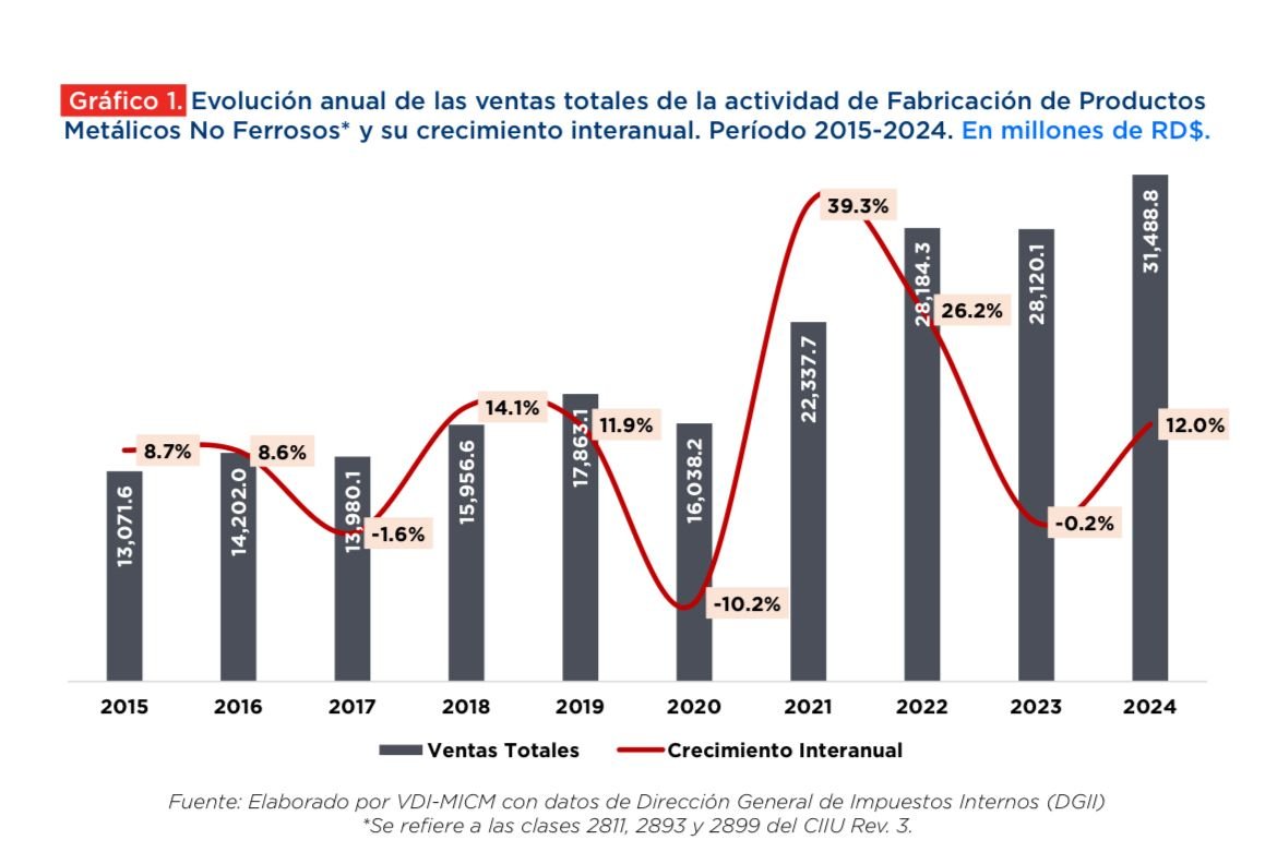Las ventas en la fabricación de productos metálicos no ferrosos registraron una tasa de crecimiento promedio anual de 10.3 %, pasando de RD$13,071.6 millones en el año 2015 a RD$ 31,488.8 millones en el 2024, según datos de la Dirección General de Impuestos Internos (DGII).