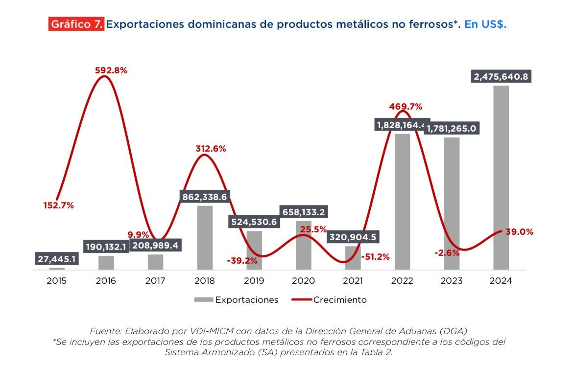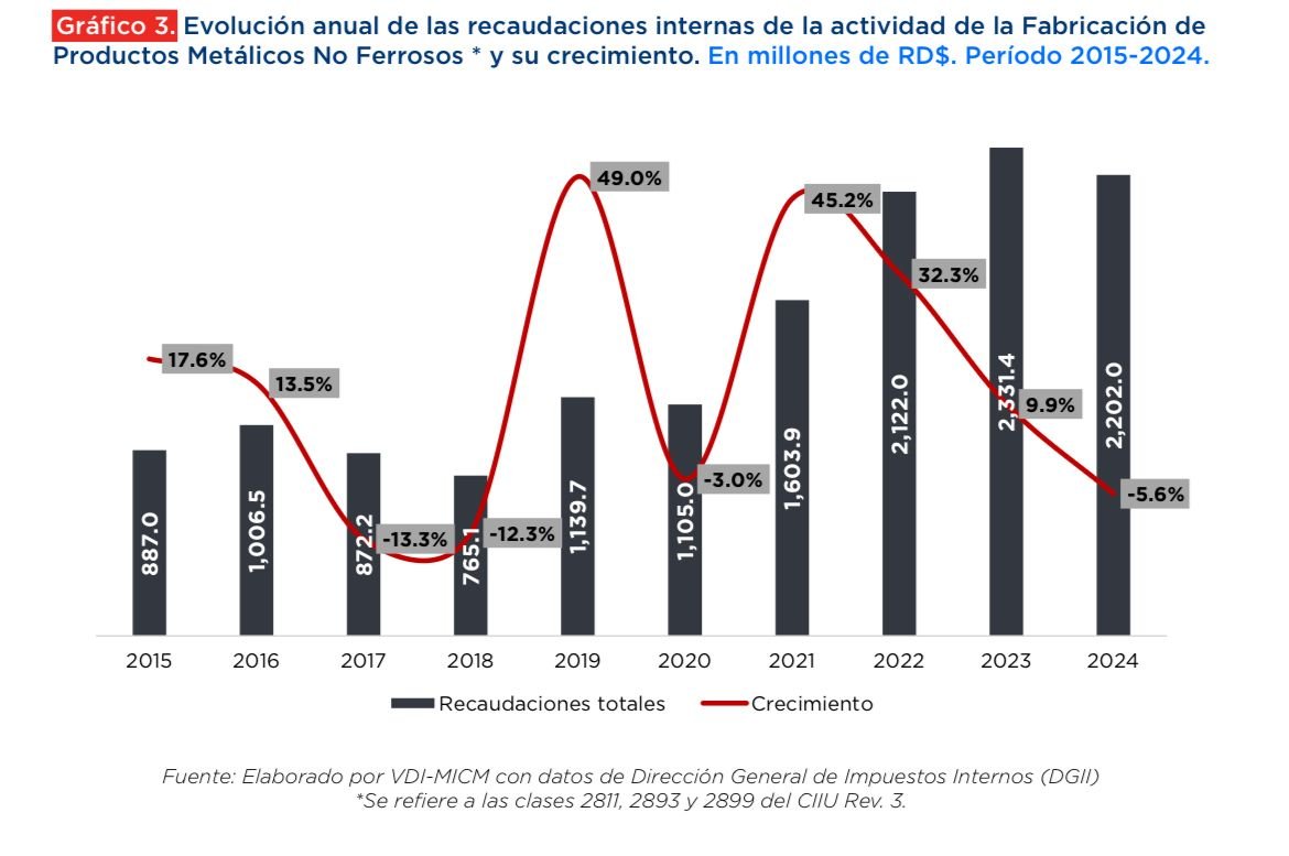 SANTO DOMINGO.- Las contribuciones al fisco dominicano por parte de la fabricación de productos metálicos no ferrosos entre 2015-2024 crecieron 10.6 % al año, pasando de RD$887.0 millones en el año 2015 a RD$ 2,202.0 millones en 2024.