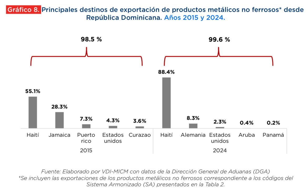 La proporción de productos exportados hacia los principales destinos ha pasado de ser 98.5 % en el año 2015 a 99.6 % en el año 2024, donde Haití se mantuvo como principal destino de exportación, representando el 55.1% de las exportaciones totales en 2015 y 88.4 % en el 2024.