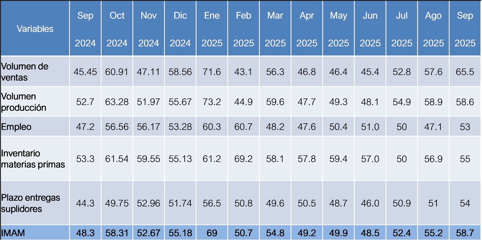 El siguiente cuadro muestra el comportamiento del IMAM ajustado por factor estacional de septiembre 2024 a septiembre 2025.