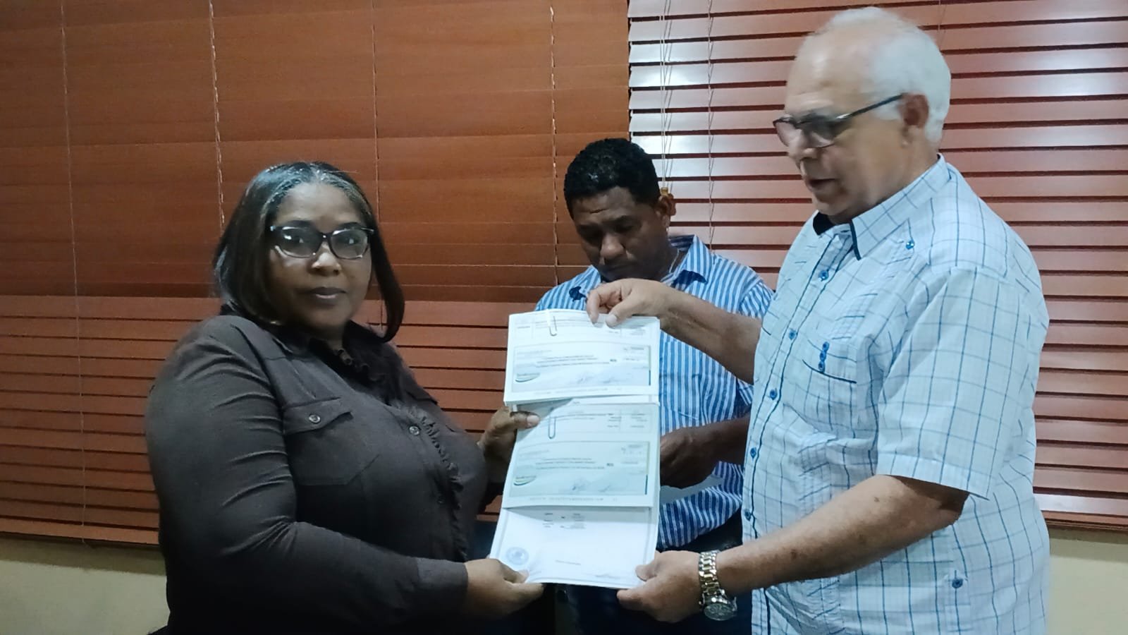 La presidenta de Coopevine, Teófila Feliz, acompañada del gerente Orlando Medina, recibió por la venta de vino dos cheques que totalizaron un valor de en un valor superior a los RD$ 5, 980,600.00.