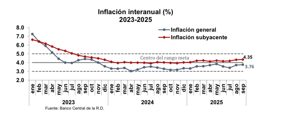 SANTO DOMINGO.- El Banco Central de la República Dominicana (BCRD) informó que el índice de precios al consumidor (IPC) registró una variación mensual de 0.34 % hasta septiembre de 2025, mientras que la inflación interanual, medida desde el mismo mes de 2024, se ubicó en 3.76 %.