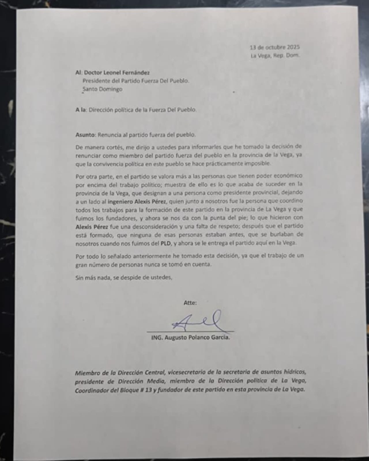 En su carta de renuncia dirigida al presidente del partido, doctor Leonel Fernández y a la Dirección Política de la Fuerza del Pueblo con fecha del 13 de octubre de 2025, Polanco justifica su decisión alegando que dentro del partido se valora más a quienes tienen poder económico que a quienes han trabajado políticamente desde los inicios.
