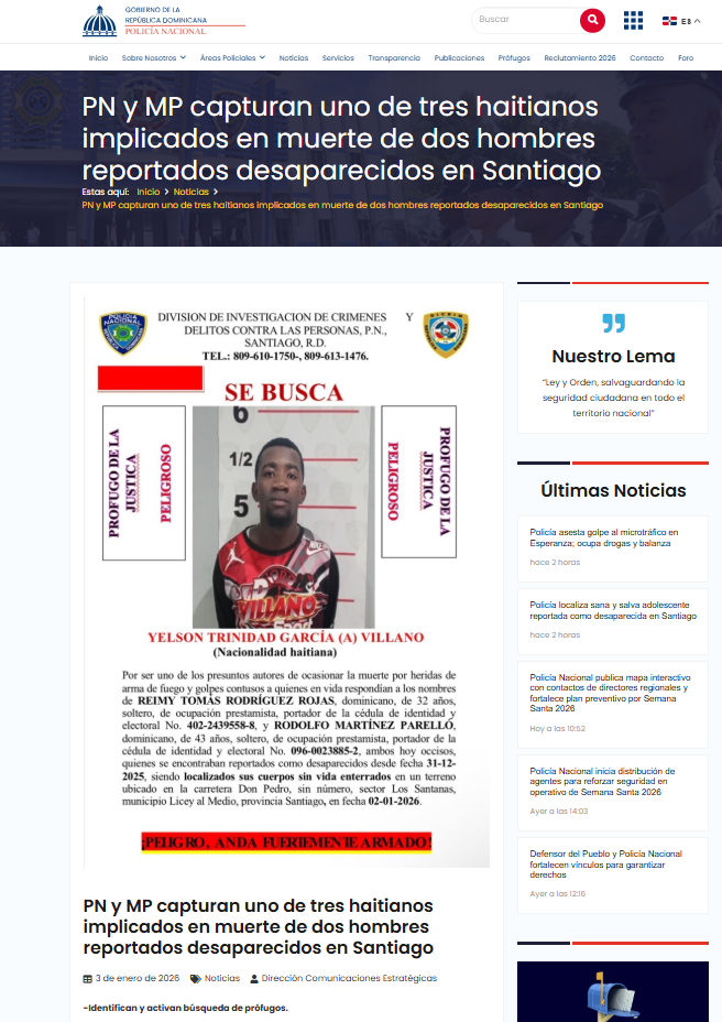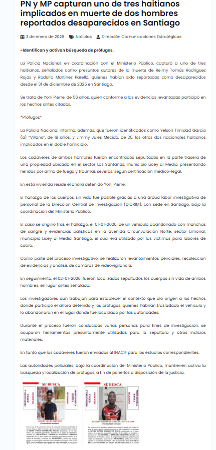 La institución los vincula a la muerte de los prestamistas Reimy Tomás Rodríguez Rojas, de 32 años, y Rodolfo Martínez Parelló, de 43, quienes habían sido reportados como desaparecidos el 31 de diciembre de 2025, tras salir desde Nagua hacia Santiago, para realizar labores de cobro.