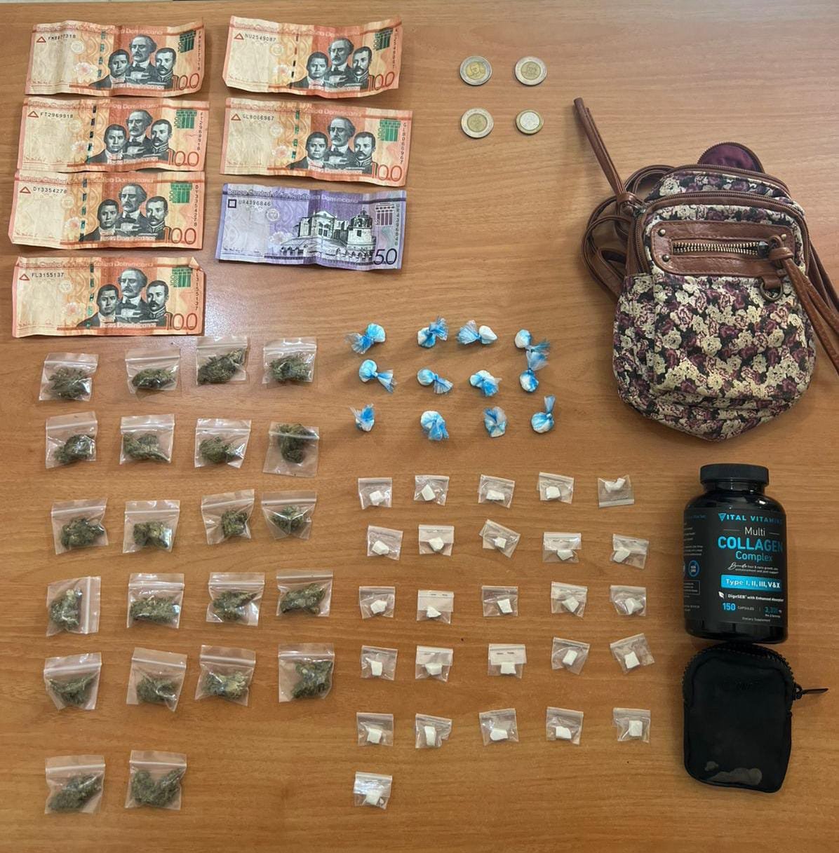 A los detenidos, ambos de 17 años de edad y cuyos nombres se omiten por razones legales, se les ocuparon 12 porciones de un polvo presumiblemente cocaína, 22 porciones de un vegetal que se presume es marihuana y 26 porciones de un material rocoso presumiblemente crack.