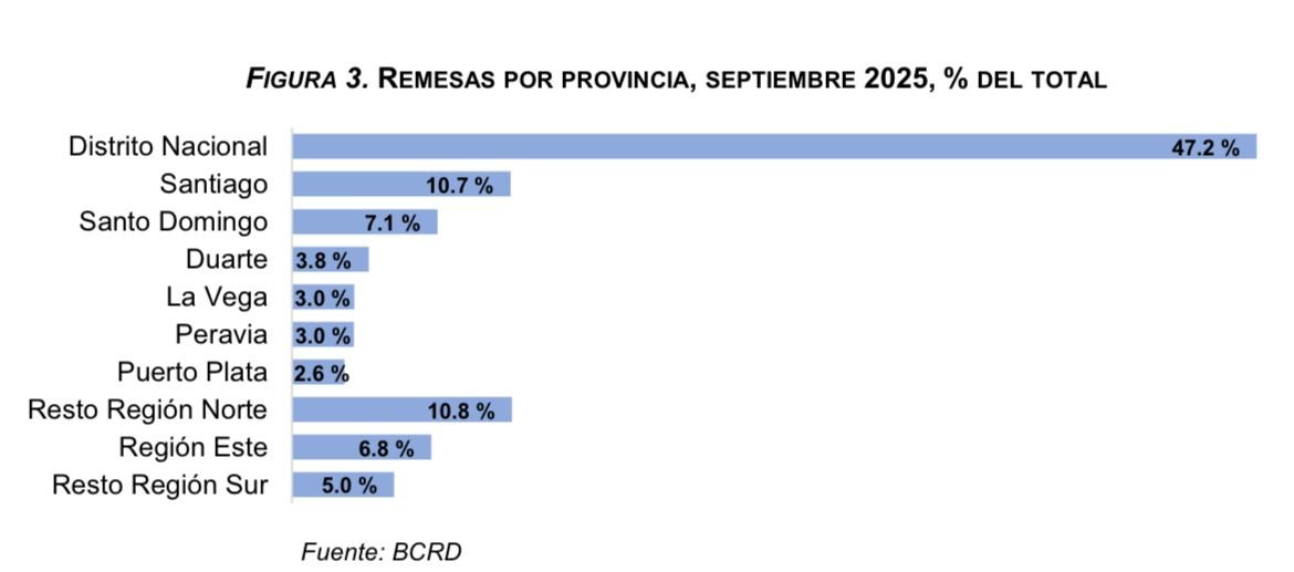 Respecto a la distribución de las remesas recibidas por provincias, el BCRD señala que el Distrito Nacional recibió una proporción del 47.2 % durante septiembre, seguido por las provincias de Santiago y Santo Domingo, con un 10.7 % y 7.1 %, respectivamente. Esto indica que cerca de dos terceras partes de las remesas (65.0 %) se recibe en las zonas metropolitanas del país.