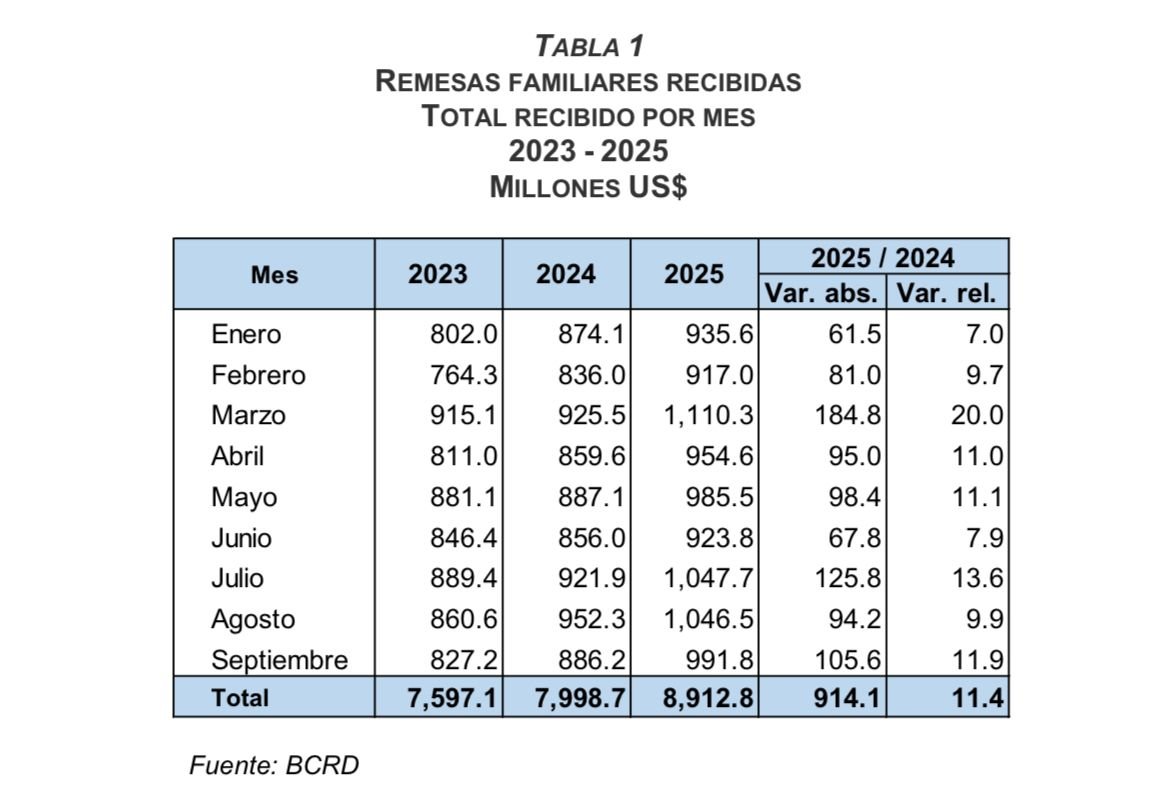 SANTO DOMINGO.- Durante el periodo enero-septiembre 2025, las remesas percibidas en la República Dominicana alcanzaron US$8,912.8 millones, aumentando US$914.1 millones (11.4 %) en comparación con el mismo período del 2024.
