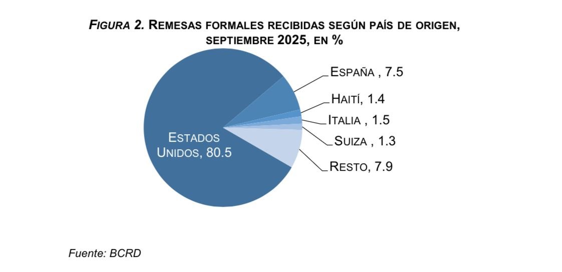 Según datos del Banco Central de la República Dominicana (BCRD), en el mes pasado se recibieron US$991.8 millones para un incremento de US$105.6 (11.9 %) respecto a septiembre del año pasado. Estos ingresos de divisas contribuyen en mantener la estabilidad relativa del tipo de cambio que se observa en la actualidad, de tal manera que al 30 de septiembre de 2025 la moneda nacional se depreció en 2.3 % con respecto al cierre de 2024.