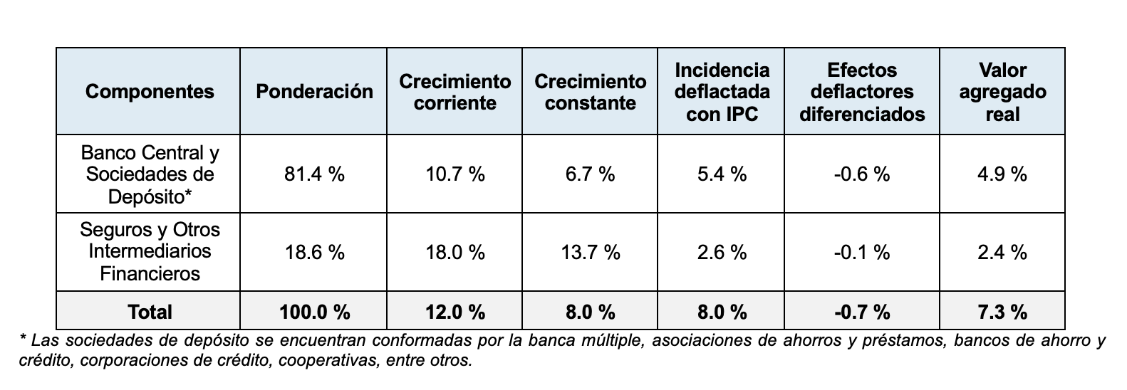 La Autoridad Monetaria manifestó que al ajustar ese valor por el Índice de Precios al Consumidor (IPC) o por inflación, en los primeros once meses del año pasado, se obtuvo un crecimiento real de 8.0 %, donde la intermediación financiera alcanzó el 7.3 %.