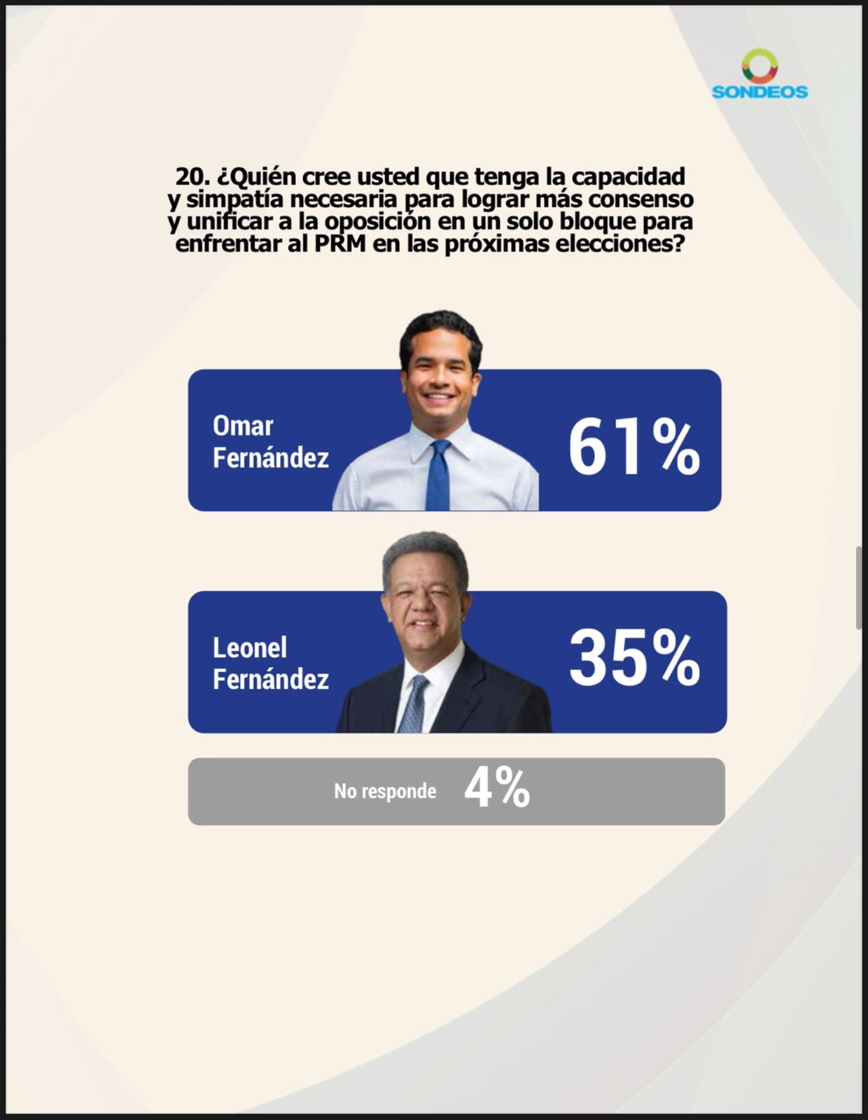 Ante la pregunta: ¿Quién cree usted que tenga la capacidad y simpatía necesaria para lograr más consenso y unificar a la oposición a la oposición en un solo bloque para enfrentar al PRM en las próximas elecciones?, Omar superó a su padre Leonel Fernández con un 61 % frente a 35 %. Un 4 % no respondió.